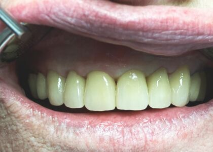 Die in Metallkeramik verblendete Kronen und Brücken stellen eine ästhetisch ansprechende und äußerst langlebige Lösung dar. Metalgerüste werden bevorzugt bei großspanningen Brückenkonstruktionen aufgrund ihrer hohen Stabilität eingesetzt. In diesem Fall entschied man sich für eine hochgoldhaltige Aufbennlegierung. Das Gerüst wurde im CAD/CAM Verfahren hergestellt und mit Keramikmassen verblendet. Die Keramik wird auf das Metallgerüst von Hand aufgetragen, anschließend erfolgt ein Brennvorgang in einem speziellen Keramikofen bei 850 Grad. Die verwendete Verblendkeramik ist abriebfest und widersteht Verfärbungen. Im abschließenden Brennvorgang wird die Verblendkeramikmasse mit einer dichten Glasur überzogen.